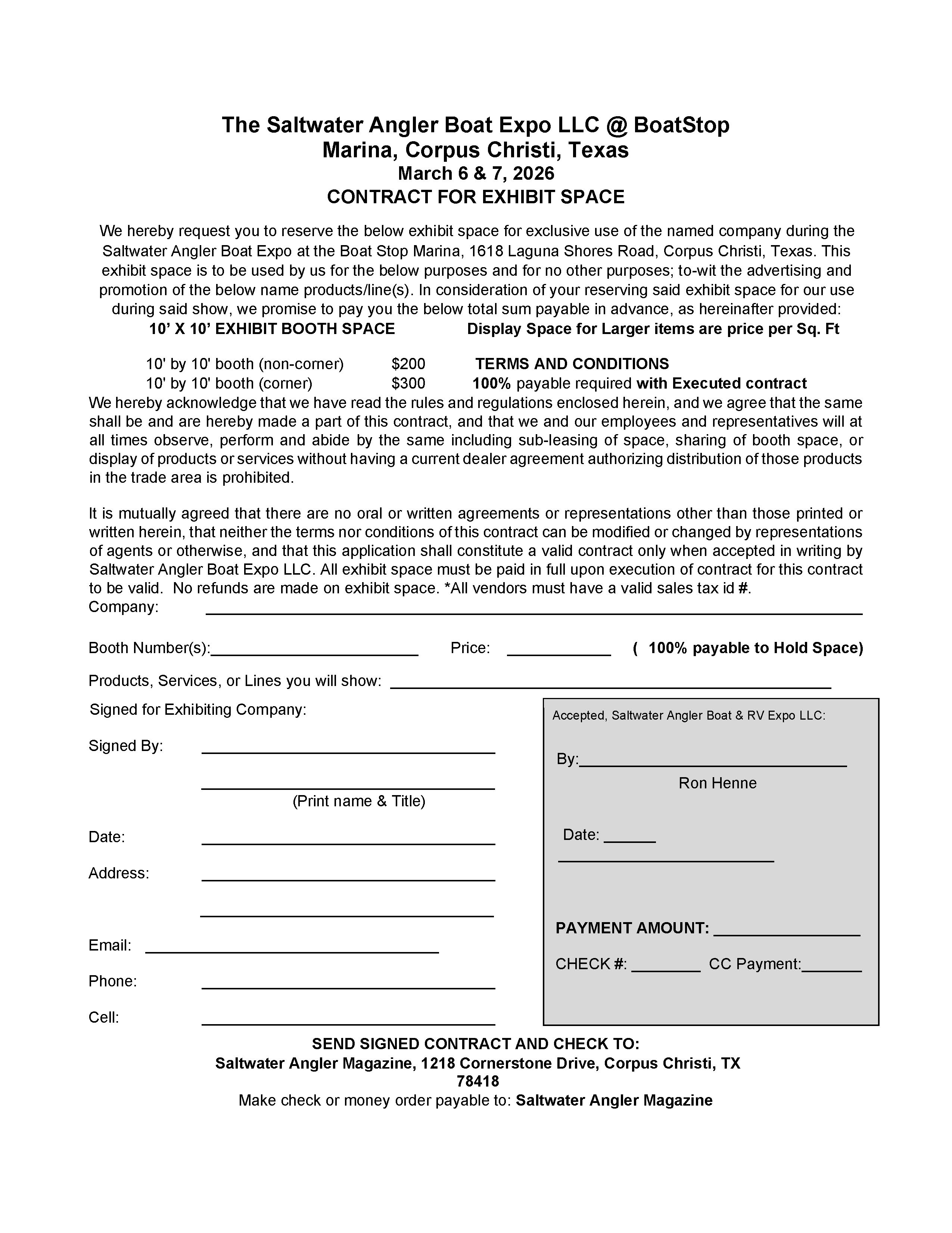 Please call (361)438-7572 or Email us @ info@ccboatshow.com. We will email Agreement, once Agreement is received back from Vendor with available space requested and signature, a confirmation, and an invoice will be sent to vendor within (24) hours. No space is guaranteed, unless payment has been received, and verified that space is available. Please pick your 1st, 2nd, and 3rd options. I will update available space on layout.